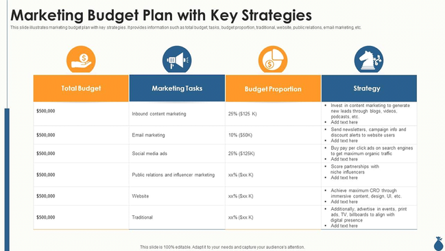 When putting a strategy into practice, take into account the marketing budget you’ll devote. There are several reasons why marketing is expensive, such as paid commercials, marketing software, events, and outsourced expenditures. When creating the plan, take your budget into account so you have money to use for marketing strategies that will help you reach your goals.