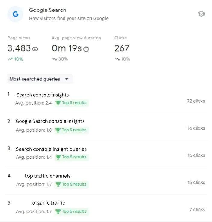 The Search Console Insights dashboard provides a wealth of data on your website’s performance, including information on your most popular pages, top search queries, and user behavior. Some of the key metrics and insights available in it include: